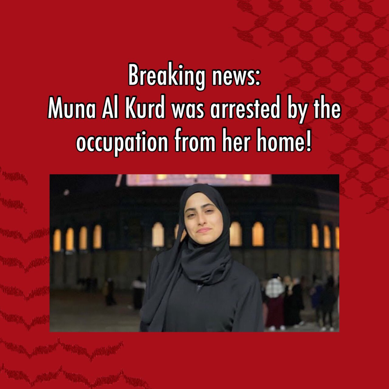 Budeiri was released a few hours later. They also had an arrest warrant for her brother. Muna al kurd has been freed after a brief detention by israel, while her brother mohammed al kurd, who had turned himself in at a police station, is still under arrest. Israeli police on sunday arrested muna el kurd, 23, the palestinian activist and resident who pioneered the save sheikh jarrah campaign for the neighbourhood at the heart of a legal battle and current. Nabil al kurd, muna's father, told palestine news agency that an israeli police force savagely raided their home, detained his daughter and handed a notice ordering her brother, mohammad, who was.